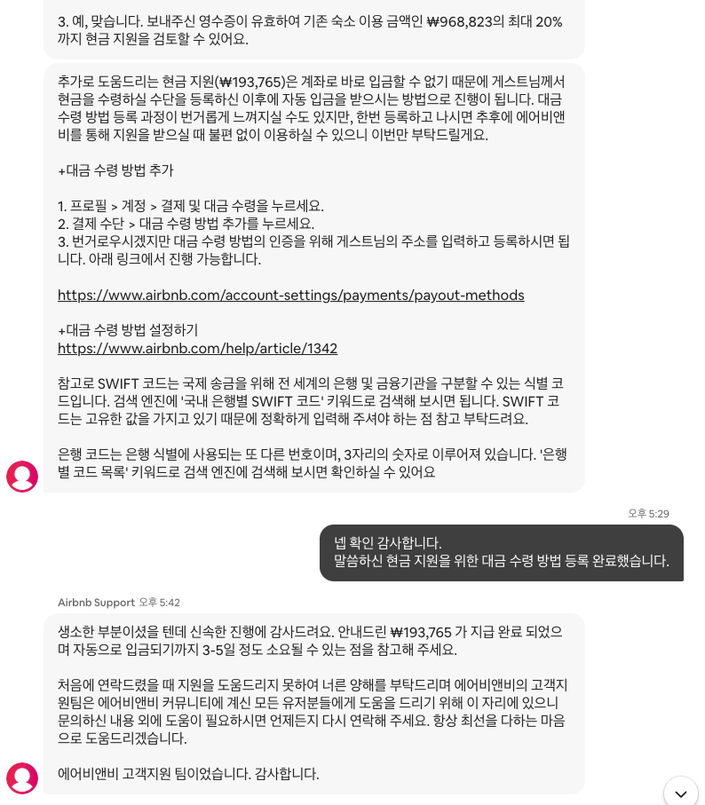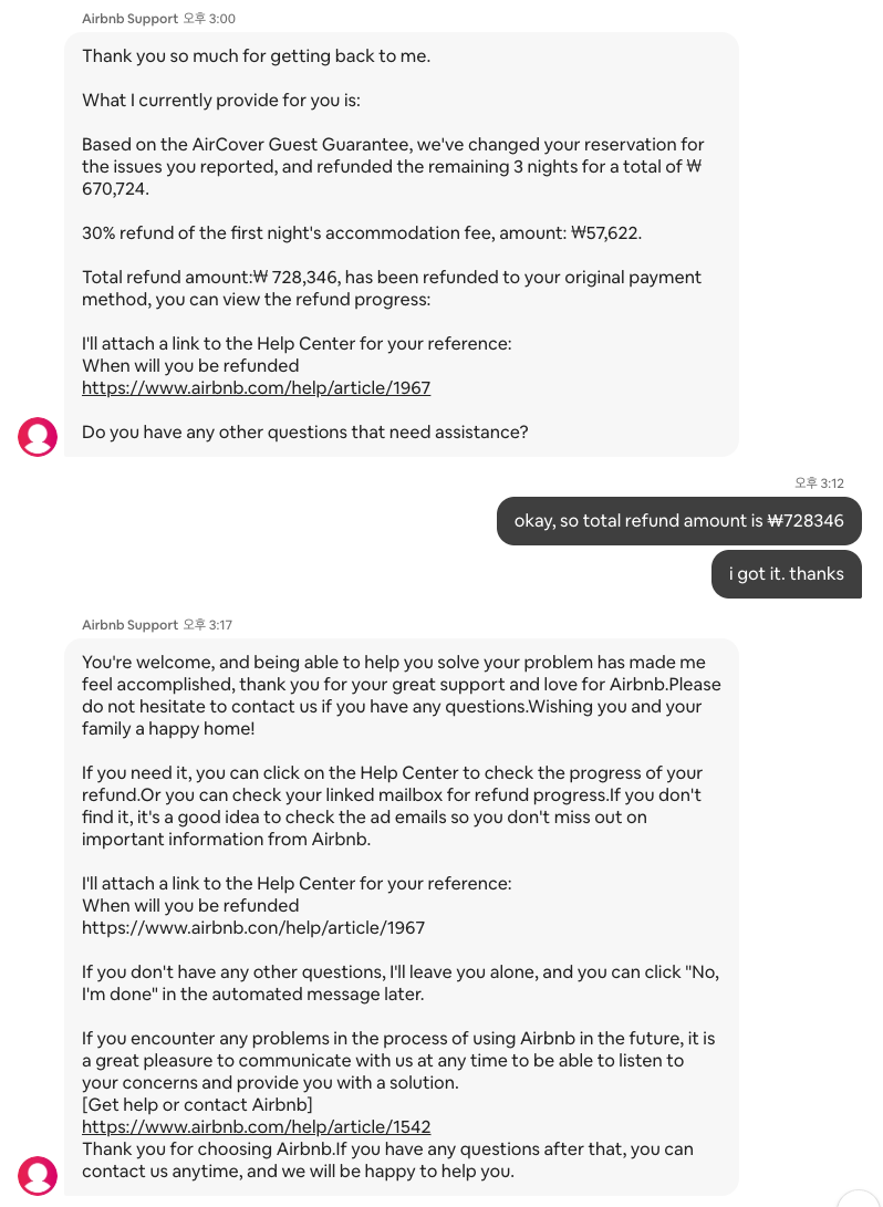 새벽 2시였음에도 불구하고, 에어비앤비 고객 지원팀은 신속하게 대응해 주었습니다.